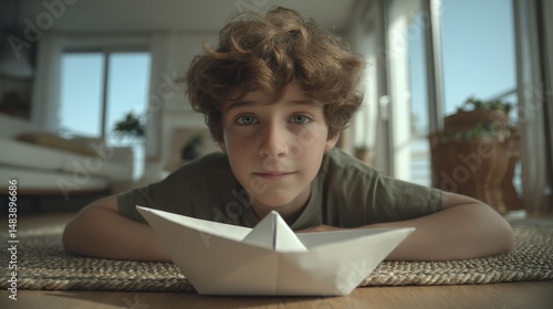 Boy lying on floor with paper boat at home