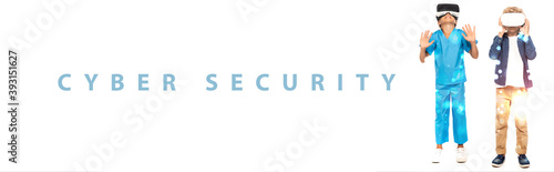 boy touching virtual reality headset while kid gesturing near cyber security lettering on white, banner