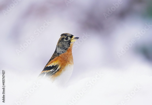 Brambling (Fringilla montifringilla) in natural habitat in Czech republic. Songbird sitting on the snow. Winter scene with a brambling.
