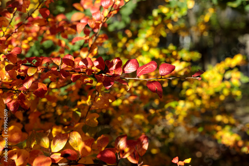 Branch with red leaves. Colorful autumn bush. Autumnal garden on a sunny day. Selective focus photography. Bright fall background.