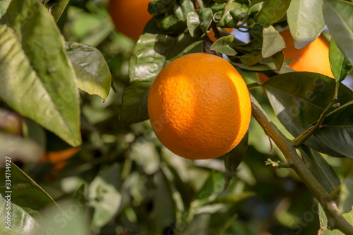 Branch with ripening orange close-up
