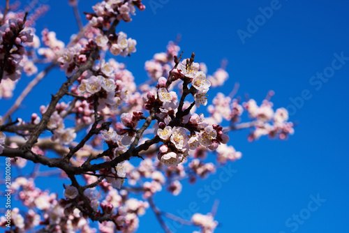 Branches of a blossoming fruit tree with large beautiful buds against a bright blue sky Cherry or apple blossom in Spring season. Beautiful flowering fruit trees. Natural background.