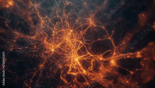 Branching glowing filaments linking in microscopic view with nodal clusters and illuminated points