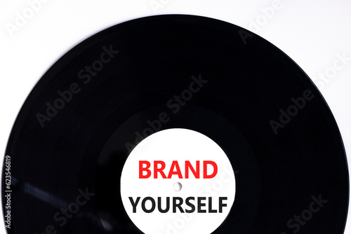 Brand yourself symbol. Concept words Brand yourself on beautiful black vynil disk. Beautiful white table white background. Business brand yourself concept. Copy space.