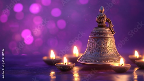 Brass temple bell with ornate carvings, set on a violet backdrop with glowing candlelight, copy space, happy Diwali background, traditional, Indian festival.