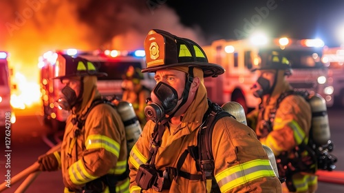Brave Firefighter Responds to Large Blaze at Night with Multiple Fire Trucks in Background, Illuminated by Emergency Lights