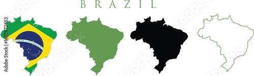 Brazil map vector icon set. Silhouette, outline, flag, flat styles. Brazil political map set on white background.