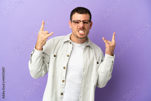 Brazilian man over isolated purple background making horn gesture