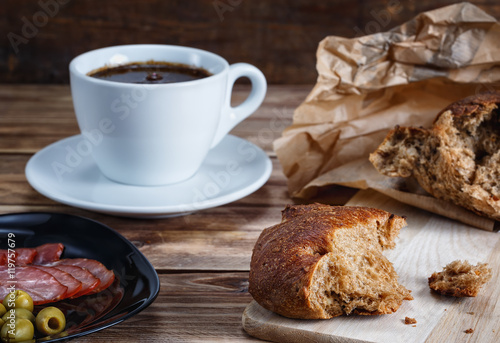 Bread, a cup of coffee , ham and olives on a wooden table lie.Focus concept.