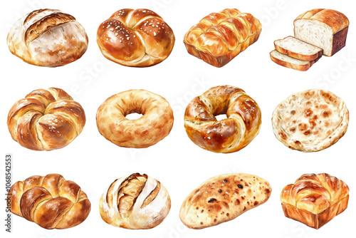 Bread png watercolor food element set, transparent background