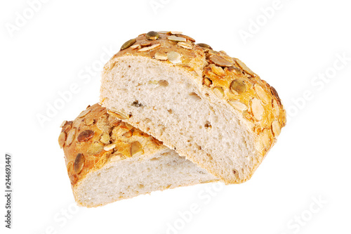 Bread with pumpkin seeds isolated on white background. Piece and Sliced roll