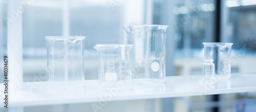 Breaker and glassware in Chemical laboratory. Analysis of Science, biological medical, research and development concepts