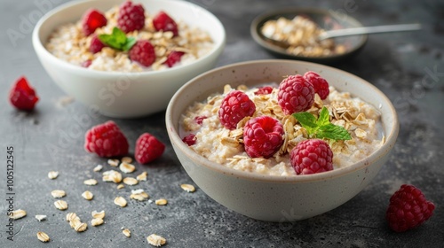 Breakfast cereal with milk yogurt and raspberry