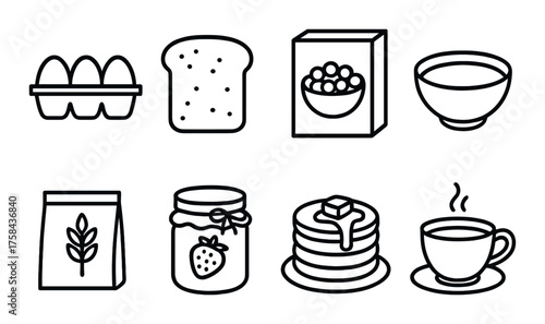 Breakfast icons: eggs, bread, cereal, bowl, flour, jam, pancakes, coffee