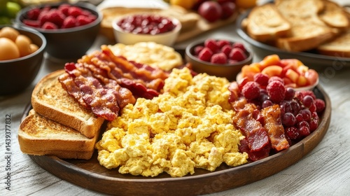 Breakfast platter featuring scrambled eggs, bacon, toast, and fruits