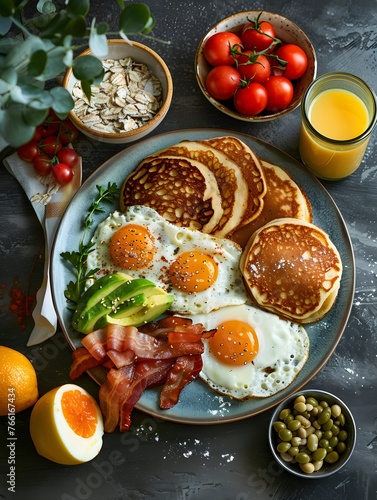 Breakfast set, fried eggs, roasted bacon, hash brown, pancakes, eggs with avocado toasts, milk and orange juice