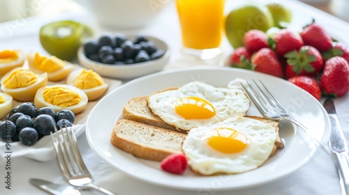 Breakfast spread with eggs toast