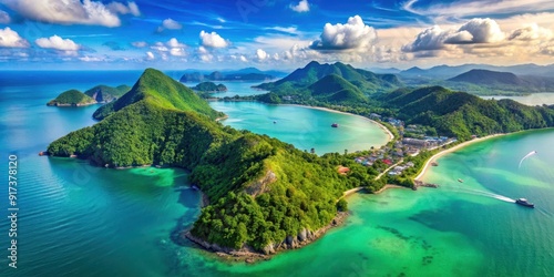 Breathtaking aerial view of Phuket islands with turquoise ocean, lush mountains, and endless adventures, Thailand