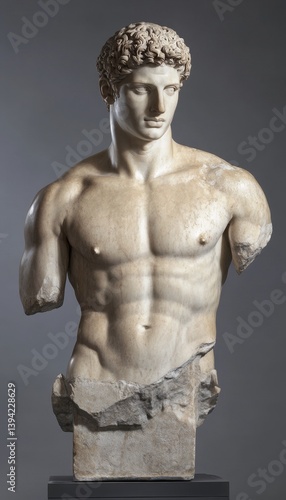 Breathtaking greek sculpture exuding serenity with a deep gaze, set against a contemporary backdrop
