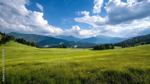 Breathtaking Mountain Landscape with Lush Green Fields and Bright Blue Sky : Generative AI