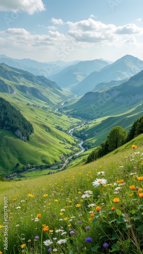 Breathtaking mountain valley with wildflowers and lush green hills under a clear sky