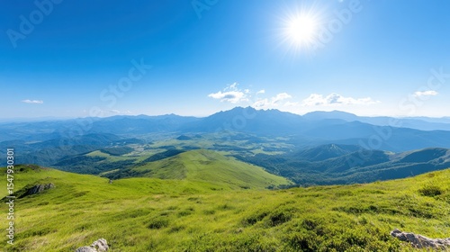 Breathtaking panoramic view of rolling green hills and majestic mountains under a clear blue sky with bright sunlight.