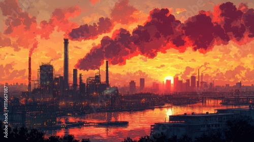 Breathtaking Sunset Over Industrial Cityscape with Smokestacks and Reflections on Water Capturing the Essence of Urban Growth and Environmental Impact