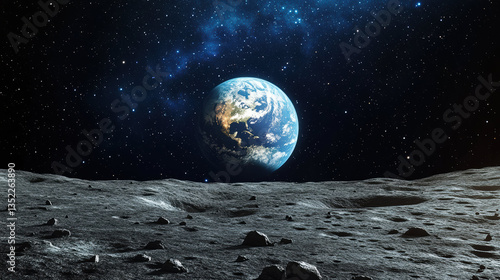 breathtaking view of Earth from Moon surface, showcasing vastness of space and beauty of our planet. lunar landscape is dotted with rocks, creating stunning contrast against starry sky