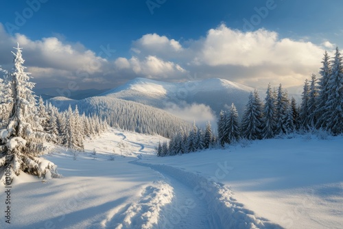 Breathtaking winter scene of the carpathian mountains with snow covered pines and sunlit peaks