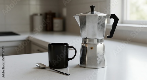 Brewing Perfection A Classic Moka Pot and Coffee Mug on a Kitchen Counter