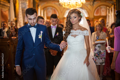 Bride and groom holding hands and walking during wedding ceremony in church