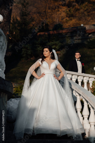 Bride and groom posing on the stairs. Just married loving couple in wedding dress and suit in autumn. Bride and groom having a romantic moments on their wedding day.
