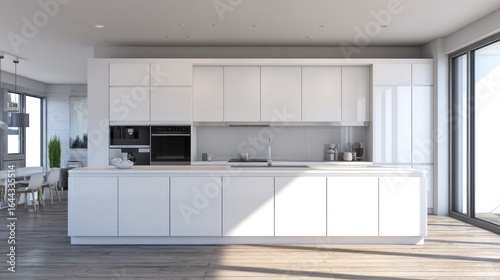 Bright, airy kitchen with white cabinets, integrated appliances, and warm wooden flooring
