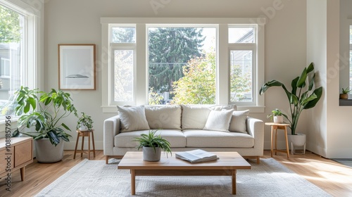 Bright and airy living room with modern furniture, plants, and large windows, creating a cozy and inviting atmosphere.