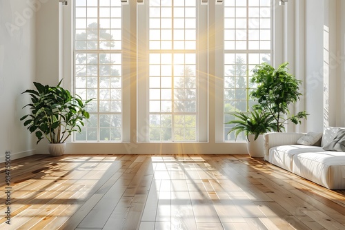 Bright and Airy Living Room with Sunlight Streaming Through Large Windows