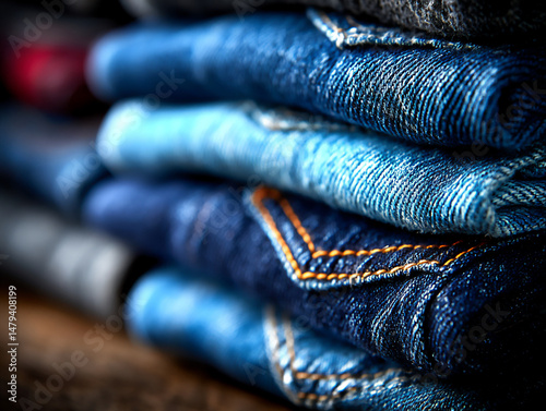 bright and calm close-up snapshot of a stack of neatly folded blue denim jeans, showcasing the different shades of blue and the texture of the denim,