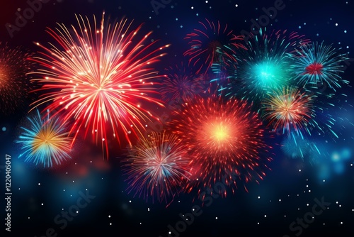 Bright and colorful fireworks exploding against a dark night sky, creating a festive and celebratory atmosphere