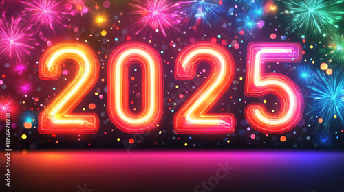 Bright and colorful fireworks illuminate night sky as year 2025 is boldly displayed in vibrant neon lights, creating festive and celebratory atmosphere