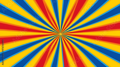 Bright and colorful radial design with yellow, blue, red, and orange stripes creating a vivid optical illusion effect