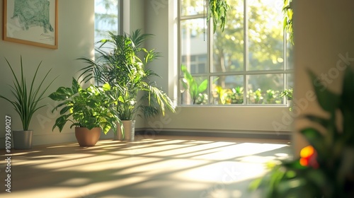 Bright and Cozy Indoor Space with Lush Green Plants and Natural Light