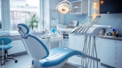 Bright and modern dental office with ergonomic chair, clean equipment, and natural lighting, creating a welcoming and professional environment for patient care.