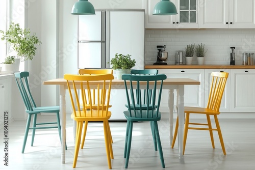 Bright and modern kitchen design featuring a dining area with colorful chairs and natural light