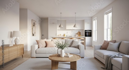 Bright and modern open living room with cozy sofas and kitchen in soft neutral tones