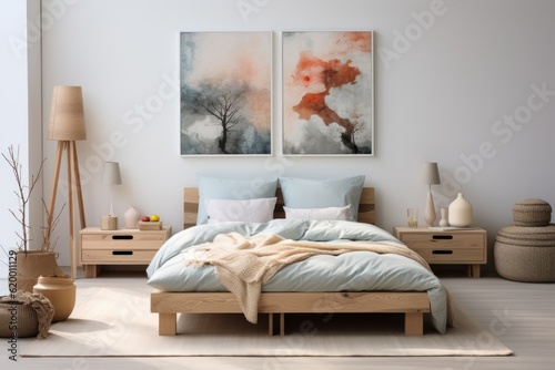 Bright and natural children's bedroom interior with wooden furniture designer equipment and a poster on a white wall