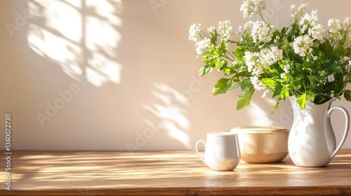 Bright and Serene Floral Arrangement on Wooden Table with Sunlight