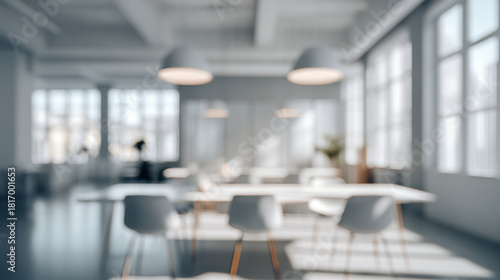 Bright and spacious modern office interior with natural light streaming through large windows onto a long wooden table and several white chairs in an open layout