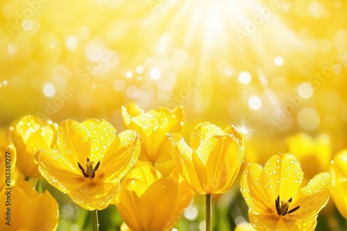 Bright and Vibrant Yellow Tulips with Dew Drops Illuminated by Sunlight in a Warm and Cheerful Floral Scene with a Soft Bokeh Background