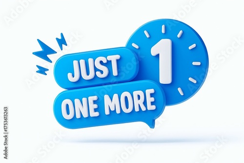 Bright blue 3d illustration of the number one next to speech bubbles saying just one more with electric sparks