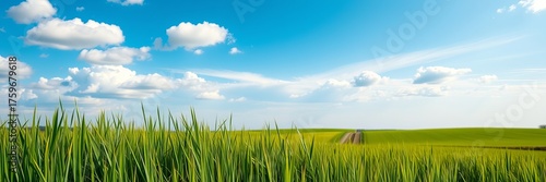 Bright blue sky with puffy white clouds over vibrant green grass field creates a serene and peaceful landscape on a beautiful sunny day in the countryside.