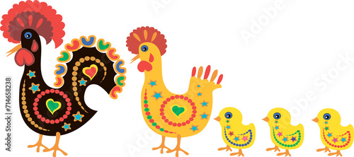 Bright cartoon rooster, hen and chicks. Print for T-shirt, fabric. Illustration on a transparent background.